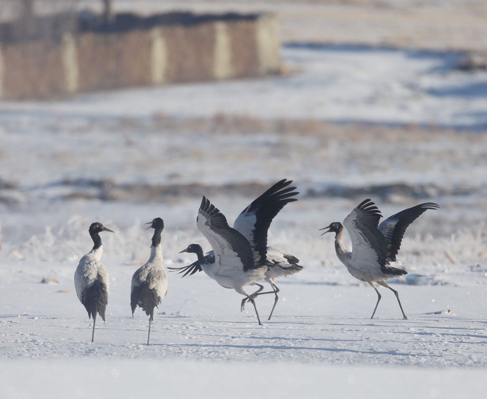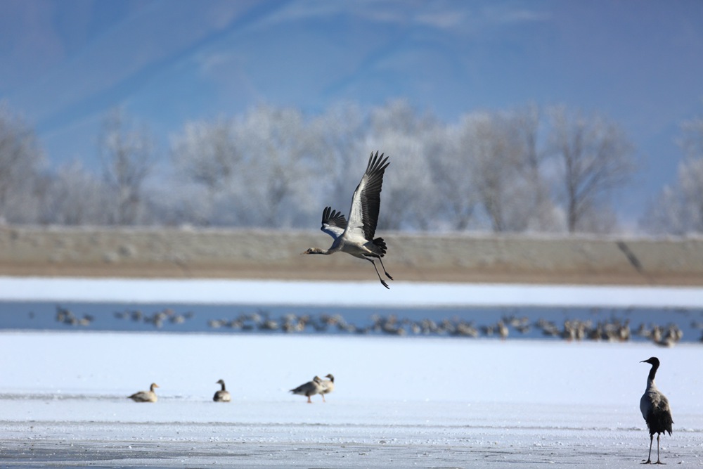 黑頸鶴是國家一級保護(hù)動物。近年來,隨著當(dāng)?shù)厣鷳B(tài)保護(hù)力度越來越大,每年11月前后至次年3月底,來林周縣越冬的候鳥越來越多。為保護(hù)黑頸鶴,林周縣出臺系列措施,專門設(shè)立多個定期投食點(diǎn),安排專人投撒青稞、小麥等黑頸鶴所需食物;成立巡護(hù)隊(duì),嚴(yán)格實(shí)行24小時巡護(hù)制度。