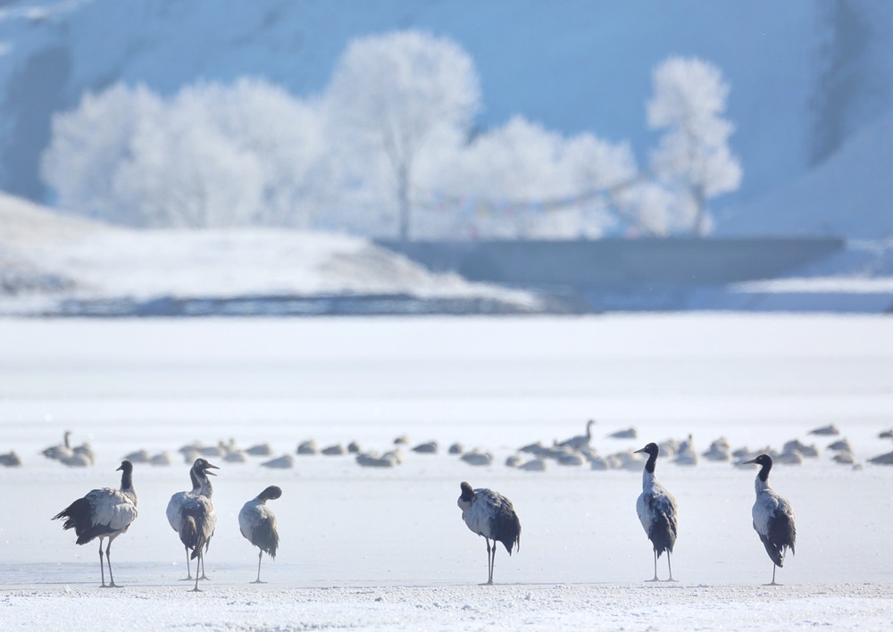 近日,西藏拉薩市林周縣迎來降雪,位于林周縣境內(nèi)的黑頸鶴保護(hù)區(qū)變成了粉妝玉砌的世界,黑頸鶴與白皚皚的大雪相互點(diǎn)綴,構(gòu)建出一幅自然和諧的冬日畫卷。