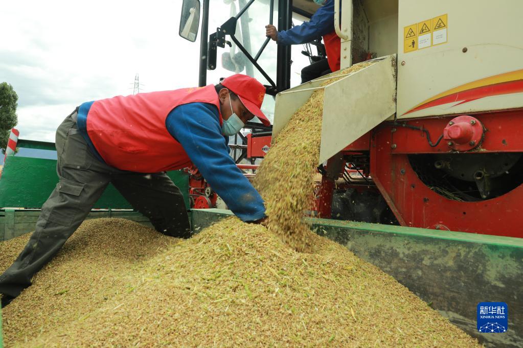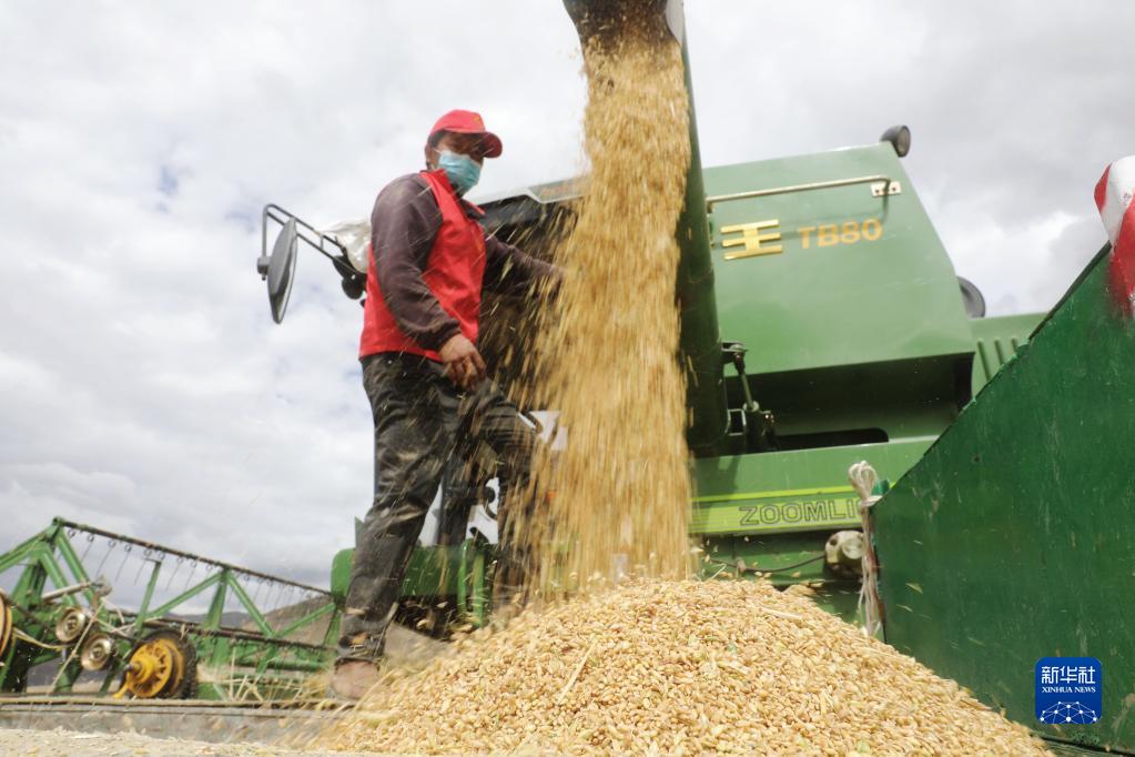 目前,西藏各地進入秋收時節。西藏拉薩市墨竹工卡縣農民在積極防疫的同時,抓緊收割青稞,確保顆粒歸倉。