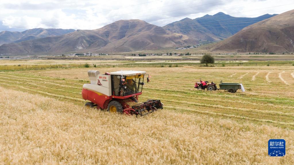 西藏拉薩市墨竹工卡縣唐加鄉農民收獲青稞(8月27日攝)。新華社發(洛克攝)