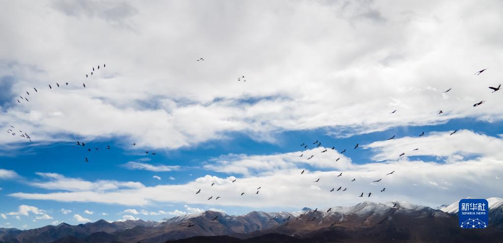 黑頸鶴群飛過林周縣強嘎鄉境內山梁(11月6日攝)。新華社記者 姜帆 攝
