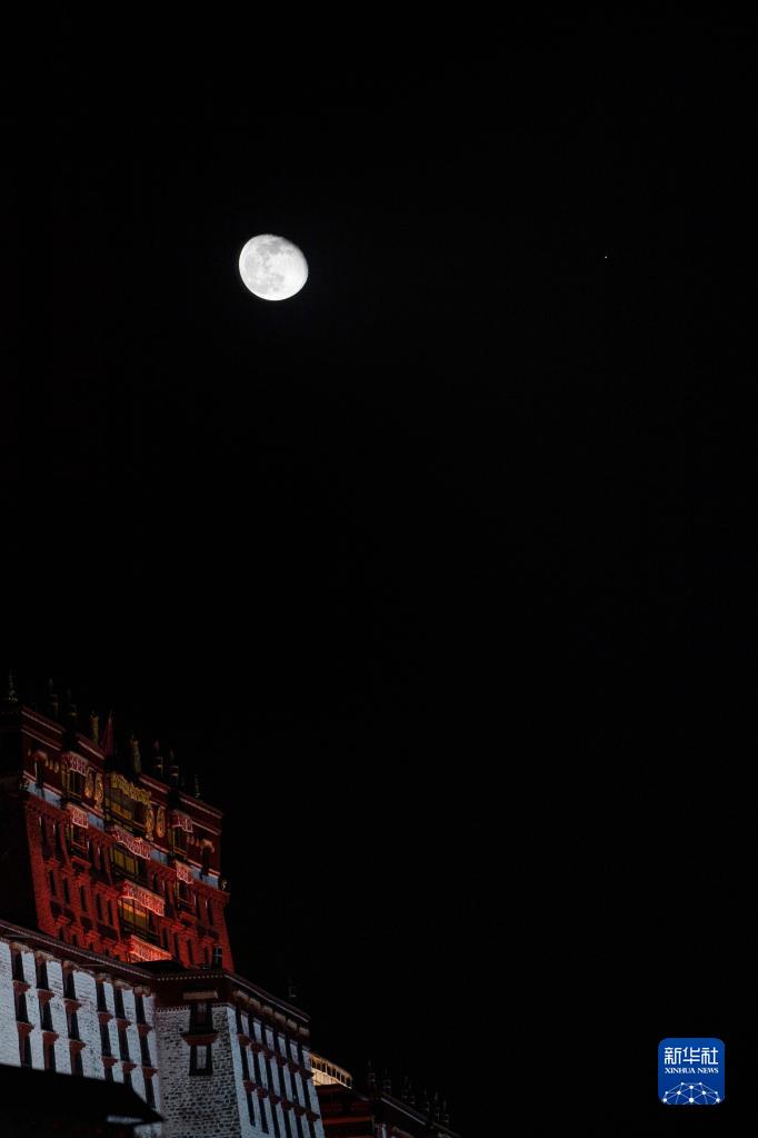 11月11日晚,一次賞心悅目的火星合月亮相天宇。這是在西藏拉薩市布達拉宮附近,記錄下的這幕“星月童話”。新華社記者 覺果 攝