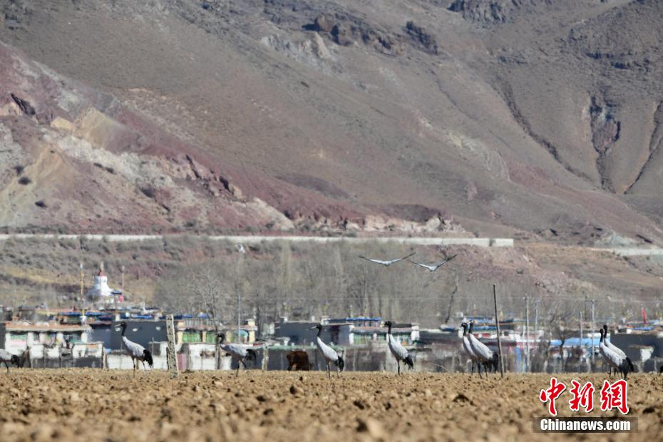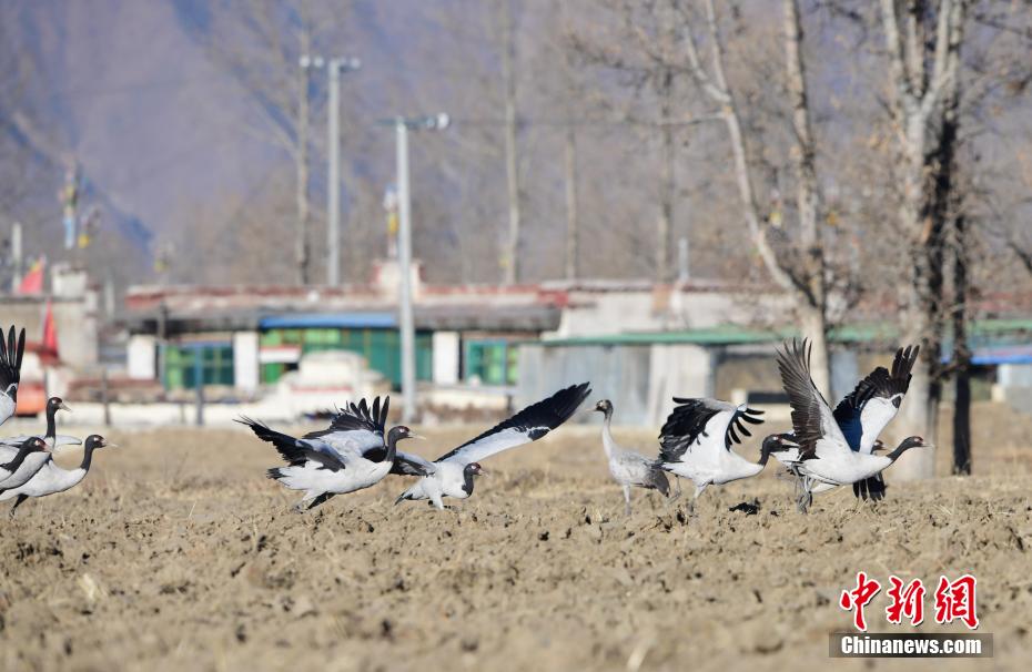 每年的10月底,成群的黑頸鶴飛到西藏拉薩市林周縣越冬,在拉薩市林周縣周邊的湖泊濕地度過5個月的“閑云野鶴”生活,次年三四月份再飛向藏北草原繁殖。黑頸鶴是世界上唯一一種高原鶴類。具有足長、喙長、頸長的典型涉禽類特征,適合在沼澤地里行走。黑頸鶴的頸、尾為黑色,體羽為灰白色。黑頸鶴是國家一級保護動物。目前,每年到林周縣越冬的黑頸鶴已達2000只左右。圖為黑頸鶴在林周境內的農田里覓食、嬉戲。 貢嘎來松 攝