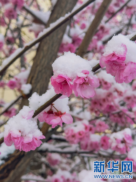 覆雪的花(3月30日攝)。新華網 柑丹鴦琦攝