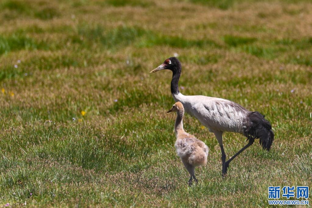西藏改則縣麻米鄉成長中的黑頸鶴(2022年7月25日)。新華社發(邊巴 攝)