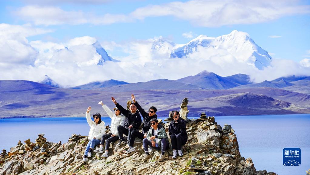 7月4日,游客在普莫雍錯湖邊拍照留念。新華社記者 陳尚才 攝