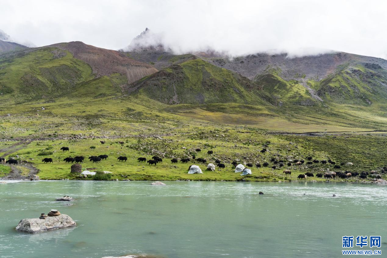 圖為湖邊悠閑吃草的牦牛(8月27日攝)。 新華網發 蘇思源 攝