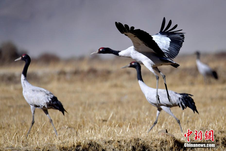 圖為11月21日,西藏日喀則市桑珠孜區邊雄鄉,黑頸鶴在田間覓食、嬉戲。李林 攝