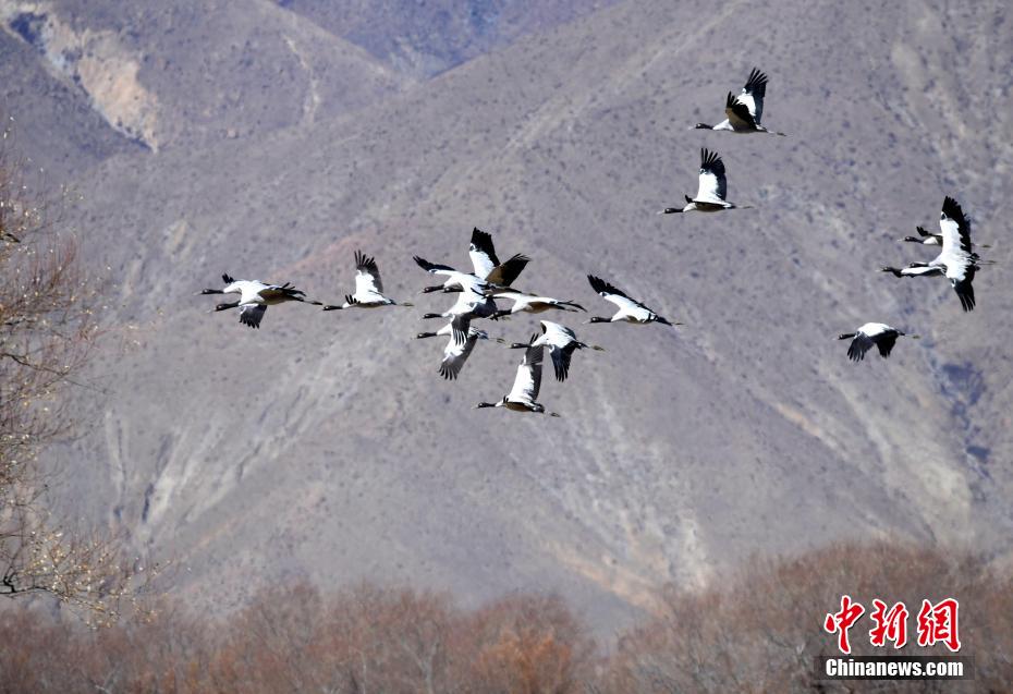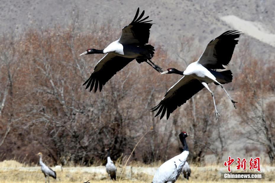 圖為11月21日,西藏日喀則市桑珠孜區邊雄鄉,黑頸鶴振翅高飛。李林 攝