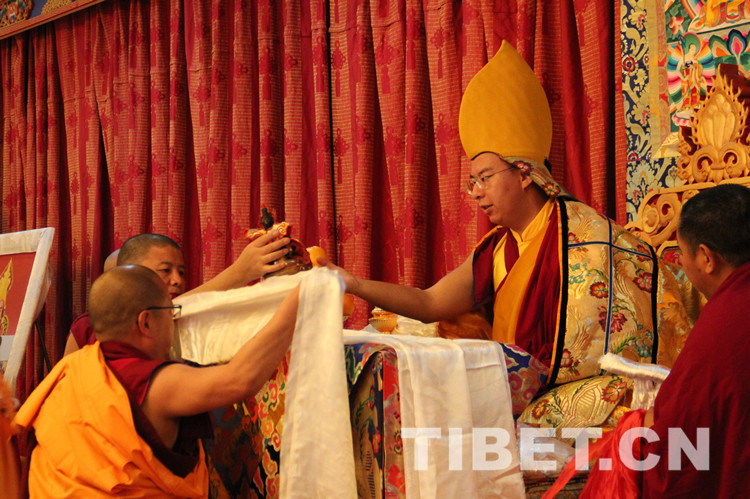 誦經結束后,土多申格副院長帶領3名經師代表和3名學員代表,向十一世班禪敬獻曼扎、佛像、佛塔、佛經,進行佛事禮拜。班禪微笑接過供奉,一一為其摸頂賜福。