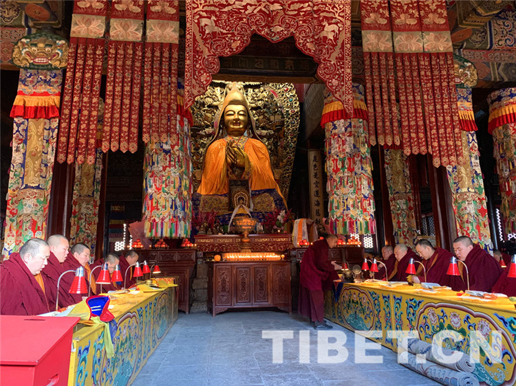 十一世班禪口念經文,百余位僧人身著戒衣,按順序分坐于大殿兩側,跟隨大師虔誠詠誦《皈依發心》《文殊師利名贊》《十世班禪大師功德新祈禱詞》《回向祈禱詞》《十一世班禪大師常住世間法》《白度母贊》《釋教昌盛祈愿》,以及《興隆正法》《消除眾劫》《六時吉祥》等。