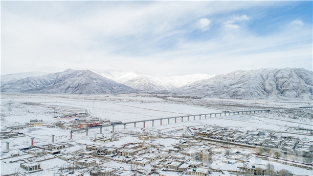 圖為拉林鐵路首座聲屏障橋梁穿過千年古鎮杰德秀
