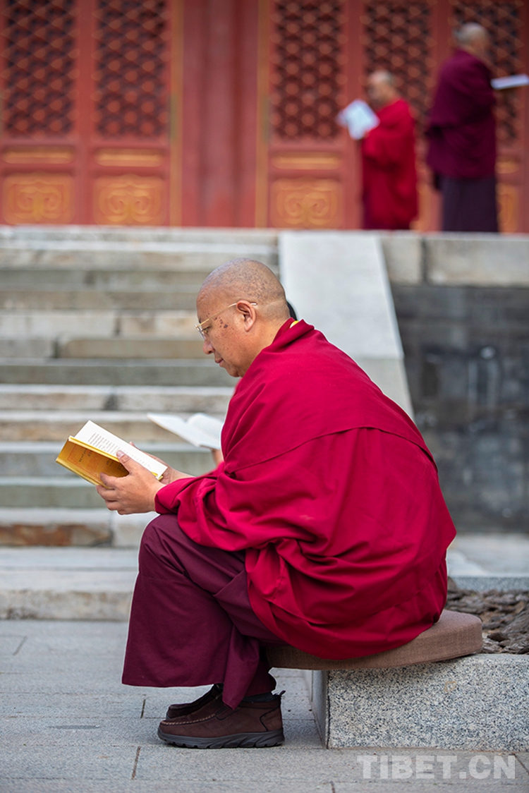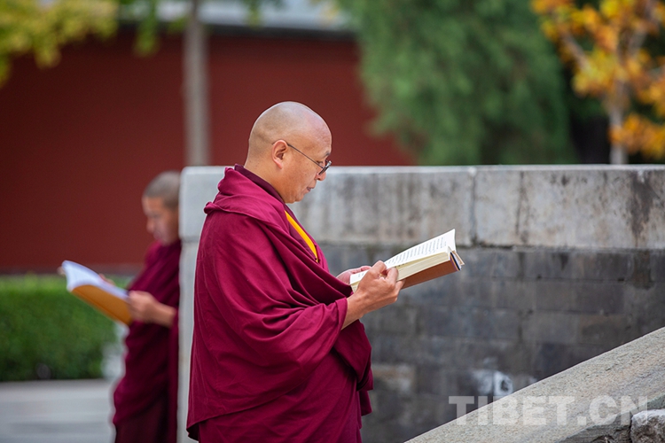 中國西藏網訊 10月29日,深秋的清晨,位于北京西黃寺的中國藏語系高級佛學院內,古柏蒼蒼,清凈肅穆。還有半個小時,2020年藏傳佛教第十六屆“拓然巴”高級學銜畢業考試辯經考試就將準時開始。等待參加辯經考試的學僧們,正在西黃寺大殿前誦經,抓緊時間為考試進行最后的準備。大家或席地而坐,或立定一隅,或踱步前行,梵唱聲聲,余音繞梁。(中國西藏網 攝影/許娜 編輯/周晶)