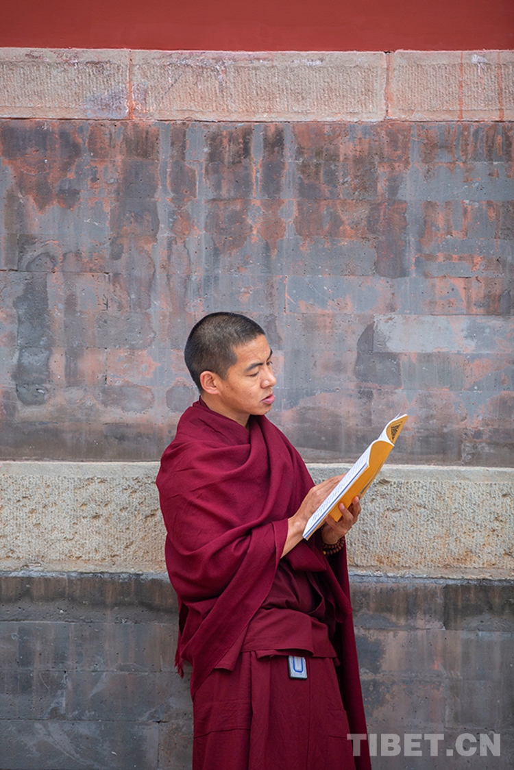 圖為即將參加2020年藏傳佛教第十六屆“拓然巴”高級學銜畢業考試辯經考試的學僧專注誦經 攝影:許娜