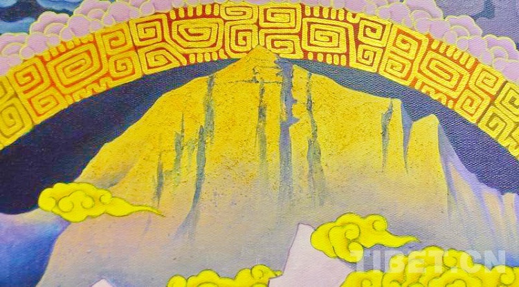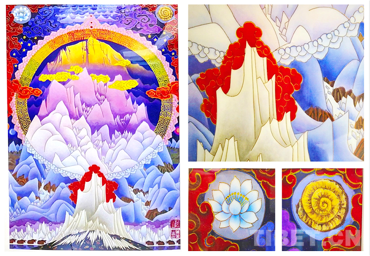 而令葉星生深受觸動的,是十世班禪大師對創作的關心、前衛的創作思路和嚴格的要求?!笆腊喽U大師多次提出指導意見,鼓勵我們大膽創新,要融入光影等繪畫新技法及漢族傳統繪畫技法,使珠峰更有立體感,使畫作成為現代藝術技法與藏族傳統繪畫手法相融合的代表,成為民族團結的象征。所以,這幅畫在結構上參考了唐卡,比如彩虹;祥云、太陽、月亮、星斗對稱的方式等來自西藏傳統壁畫藝術;但在光線、明暗對比等方面加入了漢地工筆重彩,甚至西方的藝術手法。在天地之間以更加立體的視角展現出了珠峰壯麗雄偉的全景。”