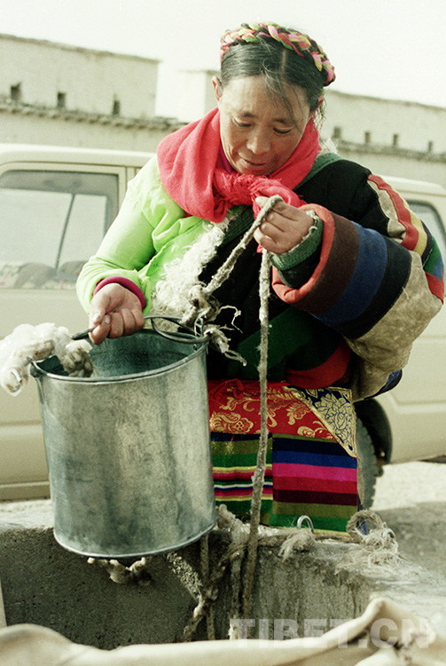 圖為文部辦事處申亞鄉女鄉長卓瑪在打井水。她當時是全國“三八”紅旗手、那曲地區唯一的女鄉長(唐召明1989年12月攝)