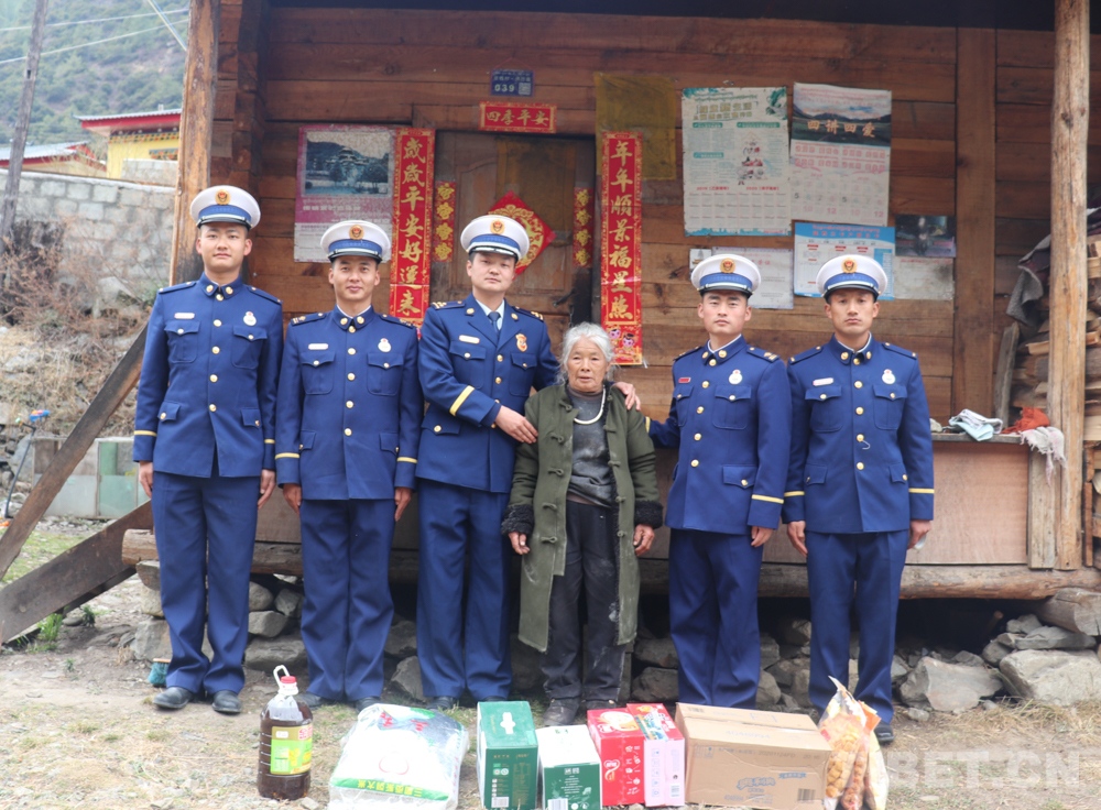 伴隨著冬日里溫暖的陽光,中隊指戰員代表帶著慰問品和節日的祝福來到了卓給阿媽家中,阿媽高興地迎接大家。指戰員們為阿媽張貼對聯、整理衣物、收拾衛生,給阿媽測量血壓,與阿媽拉家常,小屋沉浸在溫馨祥和的氛圍中。阿媽拉著指戰員的手說道:“謝謝你們經常來看我,我雖然沒有兒女,有你們的掛念,心里很滿足。”臨走時,指戰員再三叮囑阿媽有困難一定要及時聯系,她的“兒子”會經常來看望。