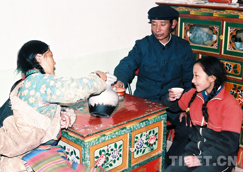 公覺扎朗的家在小鎮南邊的一排平房里,屋里擺設很簡單,只有幾件普通的藏式家具。他的夫人央金和上小學的女兒玉珍見有客人來訪,將手抓肉、酸奶、奶片、酥油茶等食物統統擺在小藏桌上,不停地勸我吃,勸我喝……最后,我還給他們一家三口人拍了張喝酥油茶的照片。