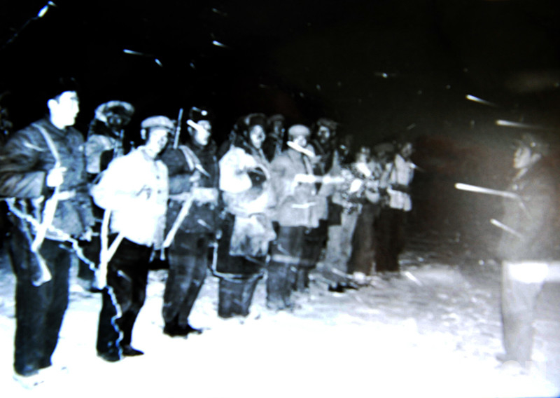 1974年,公覺扎朗(左二)等18勇士既是干部,又是民兵。這是他們清晨在冒雪訓練(唐召明翻拍資料圖片)