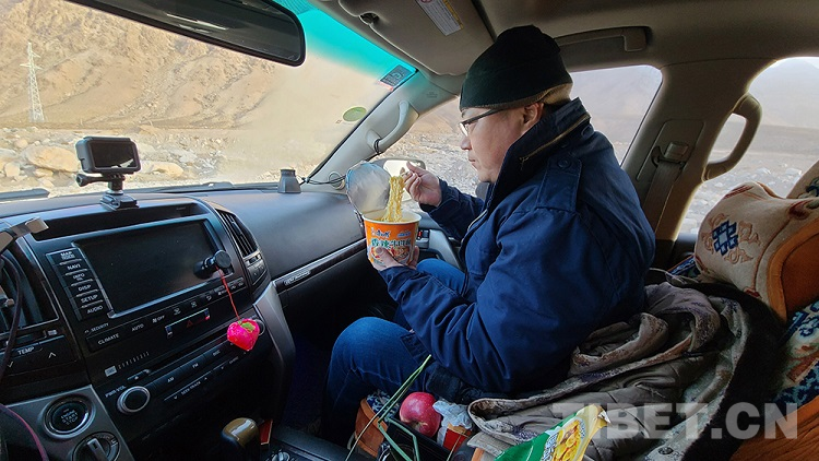 圖為呂智勇自駕向阿里普蘭運送防疫物資期間,在車里吃方便面