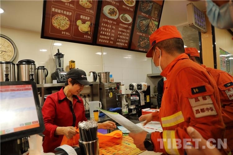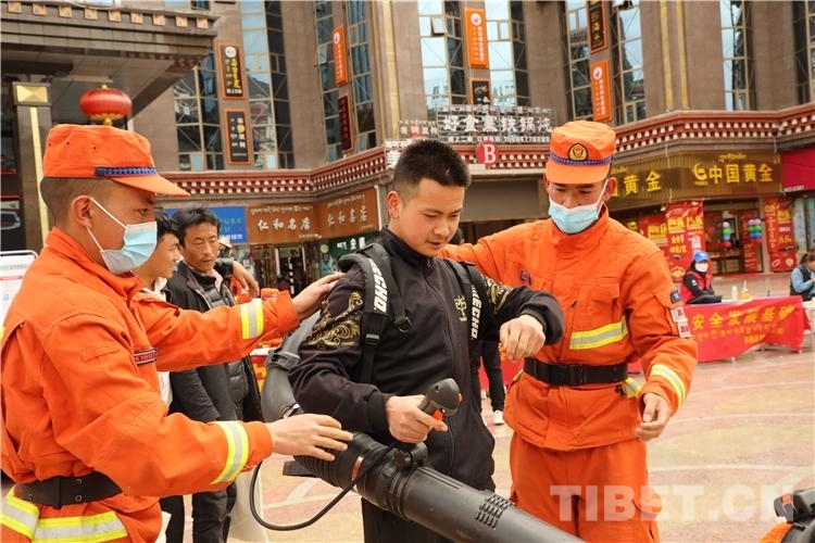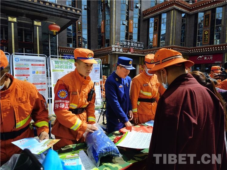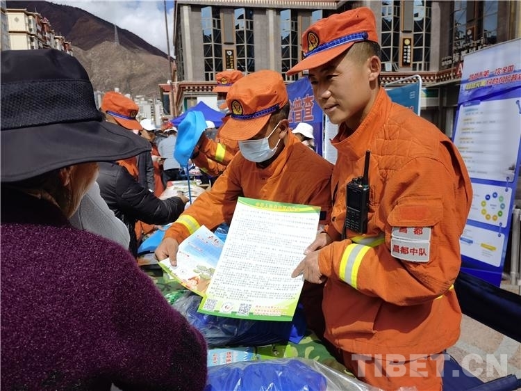 中隊指戰員同卡若區應急管理局工作人員一起走上街頭,在昌都市茶馬廣場、昌慶街等人員密集的鬧市區,向過往群眾認真講解防災減災知識,發放印有地震自救互救、防火安全常識、抗洪搶險等標語的畫冊,及防火宣傳小帽、防火宣傳圓珠筆、購物袋等宣傳物品。