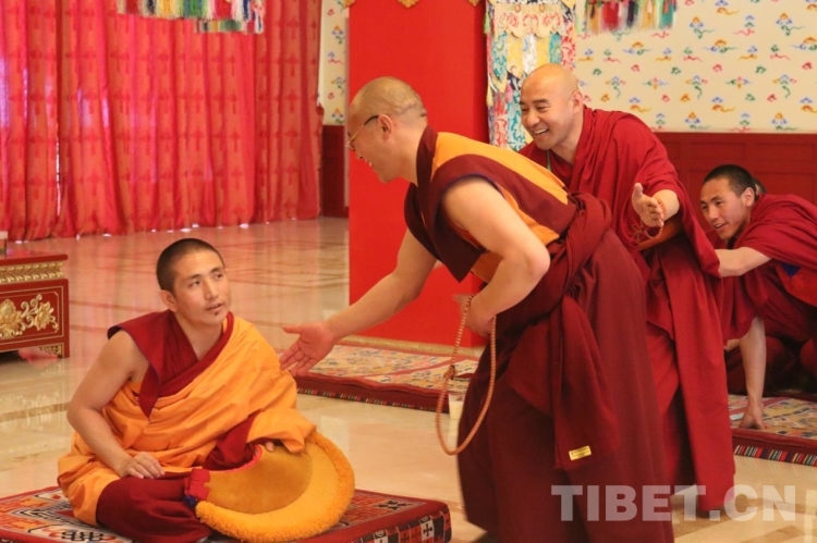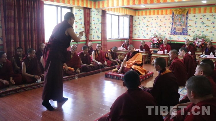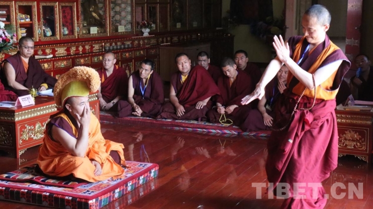 進入考場后,學僧和辯經人員分兩排盤腿相對而坐,評委就坐于考場正上方。集體誦經后,評委根據名單,依次讓學僧和辯經人員出列進行辯經。這時參加考評的學僧盤腿就坐于考場正中央,伴著兩掌相擊發出清脆的聲音,辯經人員圍繞著學僧,不斷提出問題,言辭激烈,答辯者則不僅要口若懸河,更需要沉著應對。