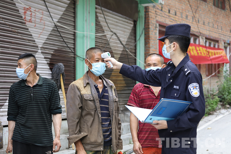 圖為邊檢站民警為駐地工人測量體溫 攝影:鄒興國