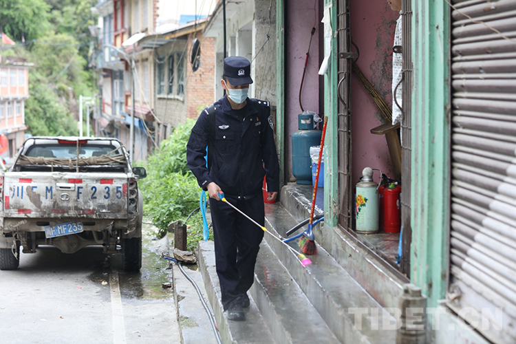 圖為邊檢站民警為駐地工人生活區消毒 攝影:鄒興國