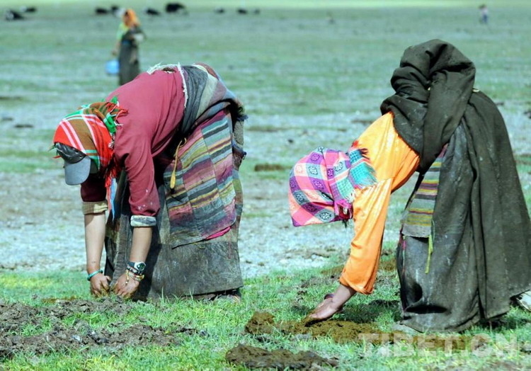 申扎縣申扎鎮三村成立了專業合作經濟組織,大家分工明確,各司其職。這是分工撿拾攤曬牛糞燃料的藏族婦女(唐召明2009年攝)