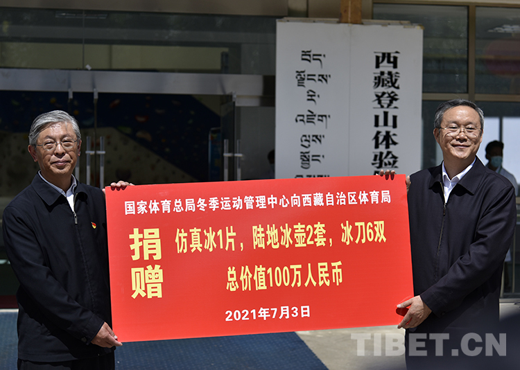 中國西藏網訊 7月3日,國家體育總局冬季運動管理中心向西藏自治區體育局捐贈物資儀式在拉薩市舉行。西藏自治區體育局獲贈仿真冰、陸地冰壺、冰刀等總價值100萬元的設施設備,助力冬季運動項目發展。
