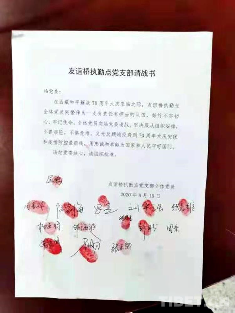 8月15日,聶拉木出入境邊防檢查站友誼橋執(zhí)勤點(diǎn)18名黨員民警在接受抗疫命令后,18名隊(duì)員在界碑前列隊(duì),舉起右拳,鄭重宣誓,踴躍請(qǐng)戰(zhàn)。“在疫情防控工作中,我自愿申請(qǐng)參與到國(guó)門(mén)一線的疫情防控工作,到口岸一線去,這是我的職責(zé)和使命……”剛分配到單位的新警李東洪在請(qǐng)戰(zhàn)書(shū)中寫(xiě)道。