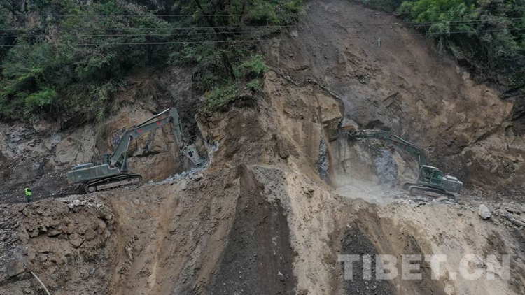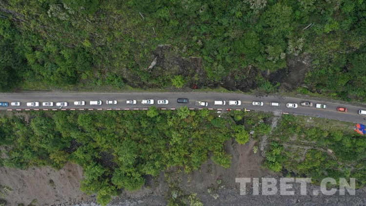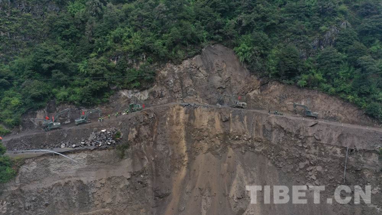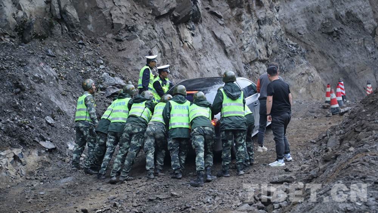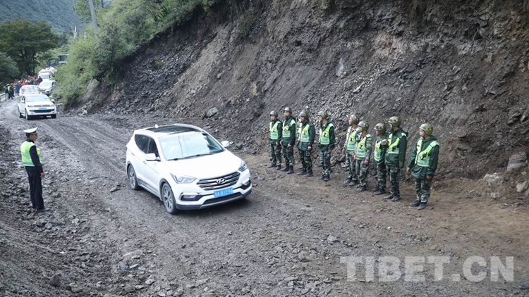 中國西藏網訊 8月28日18時許,經過武警第二機動總隊某支隊官兵連續5天的艱苦鏖戰,搶修出一條長215米的便道,使因路基垮塌造成國道318線西藏自治區林芝波密境內段斷通的道路成功恢復通行,可供小型車輛單向通行。在武警官兵的指揮下,滯留兩端的車輛有序帶隊安全通過。