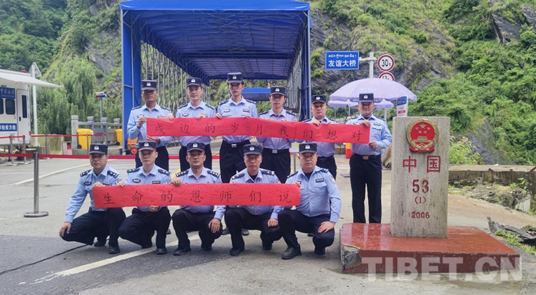 圖為友誼橋執勤點全體民警在界碑前對自己的恩師“表白” 攝影:尼瑪云丹