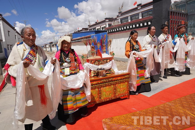 位于薩迦縣扯休鄉東北部的嘎吉林村,是庫區搬遷新村,2020年3月,全村139戶769人從海拔4000多米的土坯房搬遷到了這里海拔3800米的新房。得知班禪要來的喜訊,嘎吉林村村民及信教群眾身著節日盛裝、手捧潔白哈達,一早就自發聚集在村廣場上迎候班禪。村民旦珍高興地對記者說道:“自從搬到這兒以后,政府給我們每人分了5.5畝田地,每戶人家都享受著國家搬遷優惠政策,住上了福利幸福房。尤其是有了村里的集體合作社,再也不用像以前那樣單打獨斗各家做各自的事了。現如今,無論是生活還是經濟收入都一年比一年好。”
