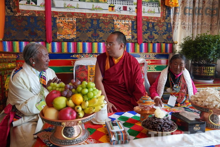 中午時分,班禪結束了對拉洛水利的調研,到扯休鄉嘎吉林村看望搬遷群眾,熱情的村民迎上前來向班禪獻上哈達和切瑪,班禪高興地揮手致意。班禪緩步來到村民歐珠老人家。班禪為家里的老人摸頂賜福,端坐在歐珠家人當中,詳細詢問搬遷后的生產生活情況。得知歐珠老人一家在搬遷后住房條件、生活條件等都有顯著改善,班禪感到十分欣慰。