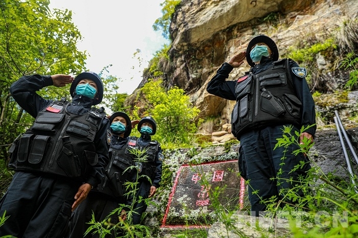 圖為?2020?年?7?月?16?日 陳塘邊境派出所民警為界碑描紅后向祖國敬禮