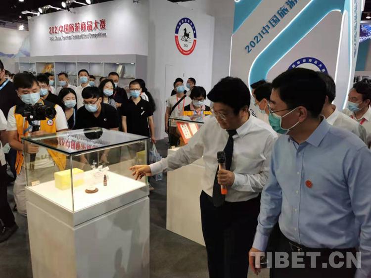 圖為國家文化和旅游部副部長杜江(右)聽取中國旅游協會旅游商品與裝備分會秘書長陳斌(左)介紹獲2021中國旅游商品大賽銀獎的“西藏禮物”文創產品“瑪尼石香氛”。