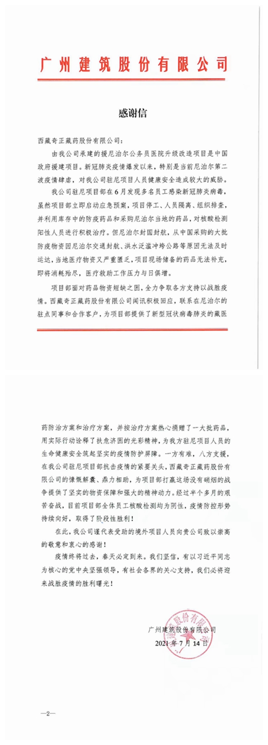 患者經(jīng)多次核酸檢測(cè)轉(zhuǎn)陰未復(fù)陽(yáng)后,廣州建筑集團(tuán)特地給西藏奇正藏藥股份有限公司寫了一份感謝信,信中寫到:西藏奇正藏藥股份有限公司為項(xiàng)目部提供了新型冠狀病毒肺炎的藏醫(yī)藥防治方案和治療方案,并按治療方案熱心捐贈(zèng)了一大批藥品,用實(shí)際行動(dòng)詮釋了扶危濟(jì)困的光彩精神,為我方駐尼項(xiàng)目人員的生命健康安全筑起堅(jiān)實(shí)的疫情防護(hù)屏障。一方有難,八方支援,在我公司駐尼項(xiàng)目部抗擊疫情的緊要關(guān)頭,西藏奇正藏藥股份有限公司的慷慨解囊、鼎力相助,為項(xiàng)目部打贏這場(chǎng)沒(méi)有硝煙的戰(zhàn)爭(zhēng)提供了堅(jiān)實(shí)的物資保障和強(qiáng)大的精神動(dòng)力。