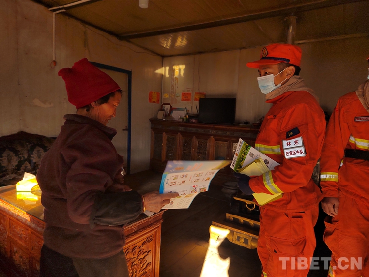 圖為巴宜區(qū)中隊指戰(zhàn)員入戶為駐地群眾普及防火知識