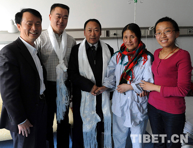 這是時任全國婦聯副主席甄硯(右一)受時任十一屆全國人大常委會副委員長陳至立委托,到北京口腔醫院看望斯求卓瑪,并送來慰問金(唐召明2010年4月14日攝)