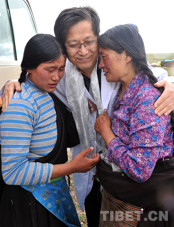 這是曾為斯求卓瑪進行手術的北京口腔醫院口腔頜面外科主任韓正學來到西藏自治區那曲市班戈縣新吉鄉,在為斯求卓瑪作術后檢查時,卓瑪母女倆奔向韓正學懷抱相擁而泣(唐召明2015年7月14日攝)