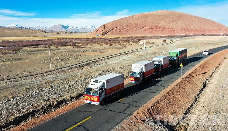 圖為運送阿里馳援陜西疫情防控保障物資的貨車從獅泉河出發 攝影:普索朗