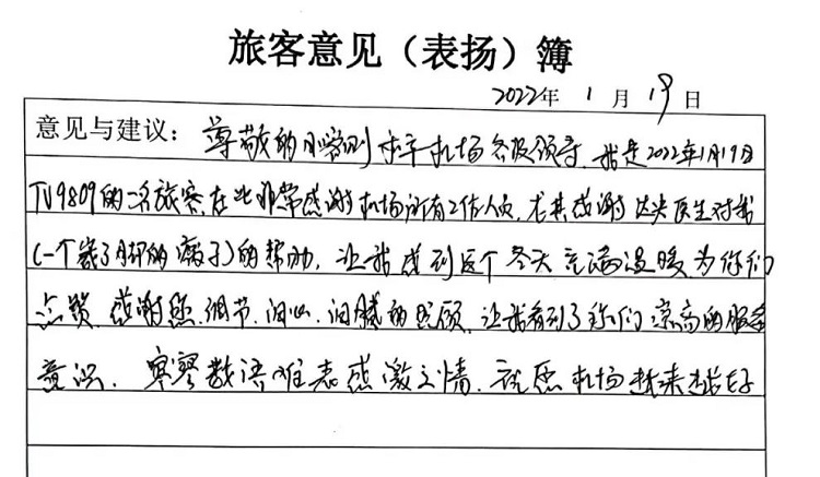 一封感謝信,寥寥數語表達了旅客對機場服務工作的理解和美好祝愿,繁忙的春運工作在冬日里多了一點溫度。