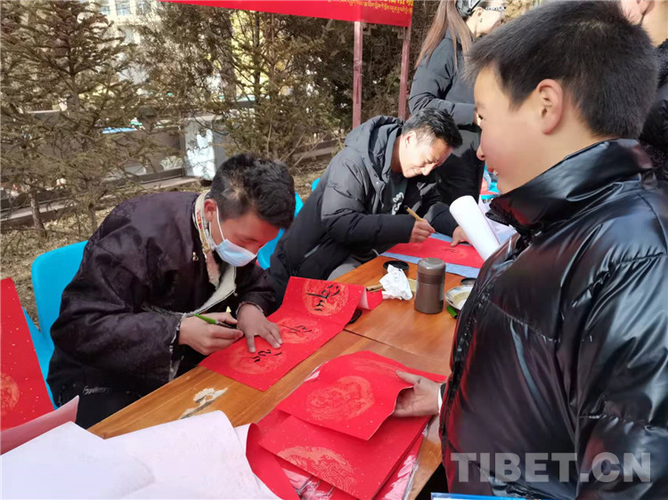 在通夏村黨群活動中心廣場,丹紙鋪就,翰墨飄香。志愿者們凝神提筆、揮毫潑墨,一張張寄托美好祝愿的“福”字躍然紙上,一副副寓意幸福吉祥的春聯引人注目。志愿者們將一幅幅滿載新春祝福和對美好生活向往的春聯送到村民手中,領到春聯的村民們,臉上洋溢著喜悅,紛紛為送春聯的書法家們點贊。昌都市書法家協會主席劉曉江說:“過春節貼春聯是我們中華民族的傳統習俗,天氣雖然寒冷,但我內心是火熱的。盡管今年過年我回不了家,但看到村民們拿到我寫的代表美好寓意的春聯,我感覺很幸福。”