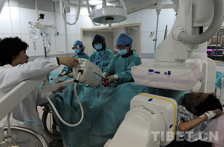 這是北京安貞醫院醫生顧虹(前右一)在北京安貞醫院為藏族婦女才塔爾實施心臟內科介入手術(唐召明2013年4月2日攝)