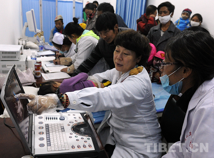 這是北京安貞醫院醫生顧虹在班戈縣人民醫院為當地兒童進行先天性心臟病篩查(唐召明2015年10月8日攝)