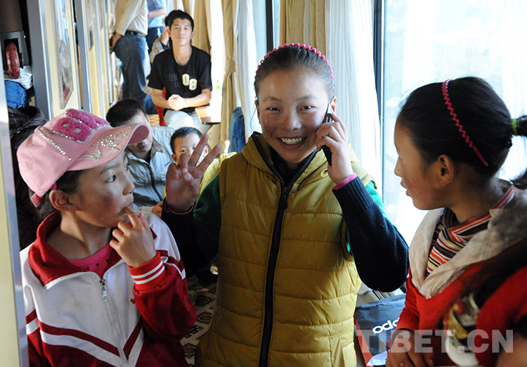 這是乘火車進京到北京安貞醫院進行先天性心臟病治療的患兒卓嘎,在火車將抵達北京時,給阿爸打電話報平安(唐召明2012年9月18日攝)