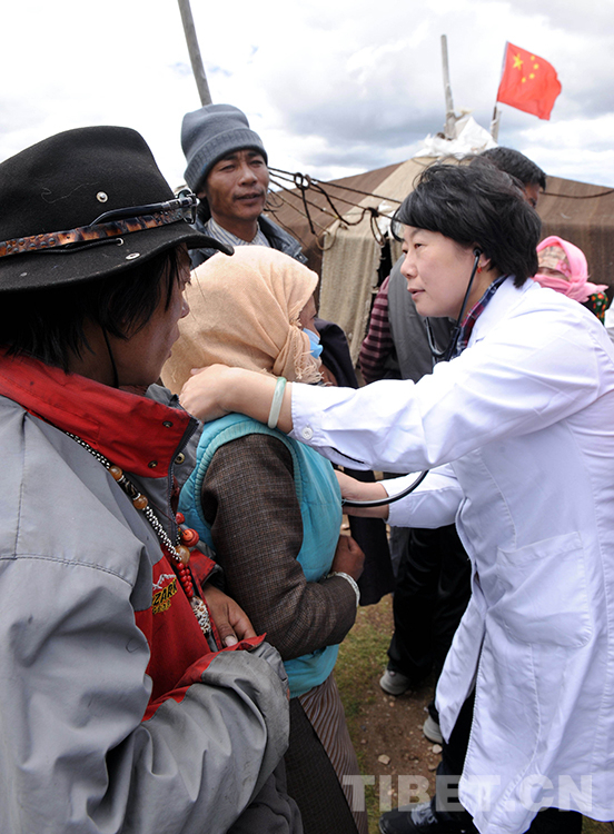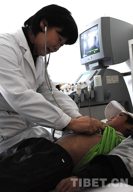 這是北京安貞醫院醫生顧虹在當雄縣納木錯鄉為牧民群眾進行先天性心臟病篩查(唐召明2012年7月29日攝)