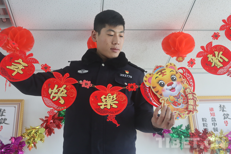 圖為日喀則邊境管理支隊昌果邊境派出所九年未回家過春節的民警郜曉占布置春節裝飾