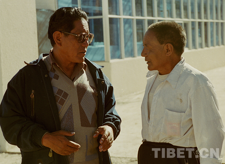 這是原雙湖辦事處首任書記,后任那曲地委(現(xiàn)那曲市)書記、西藏人大常委會副主任等職的洛桑丹珍(左)在申扎縣調(diào)研時與當(dāng)?shù)乩细刹窟M行交流(唐召明2001年攝)